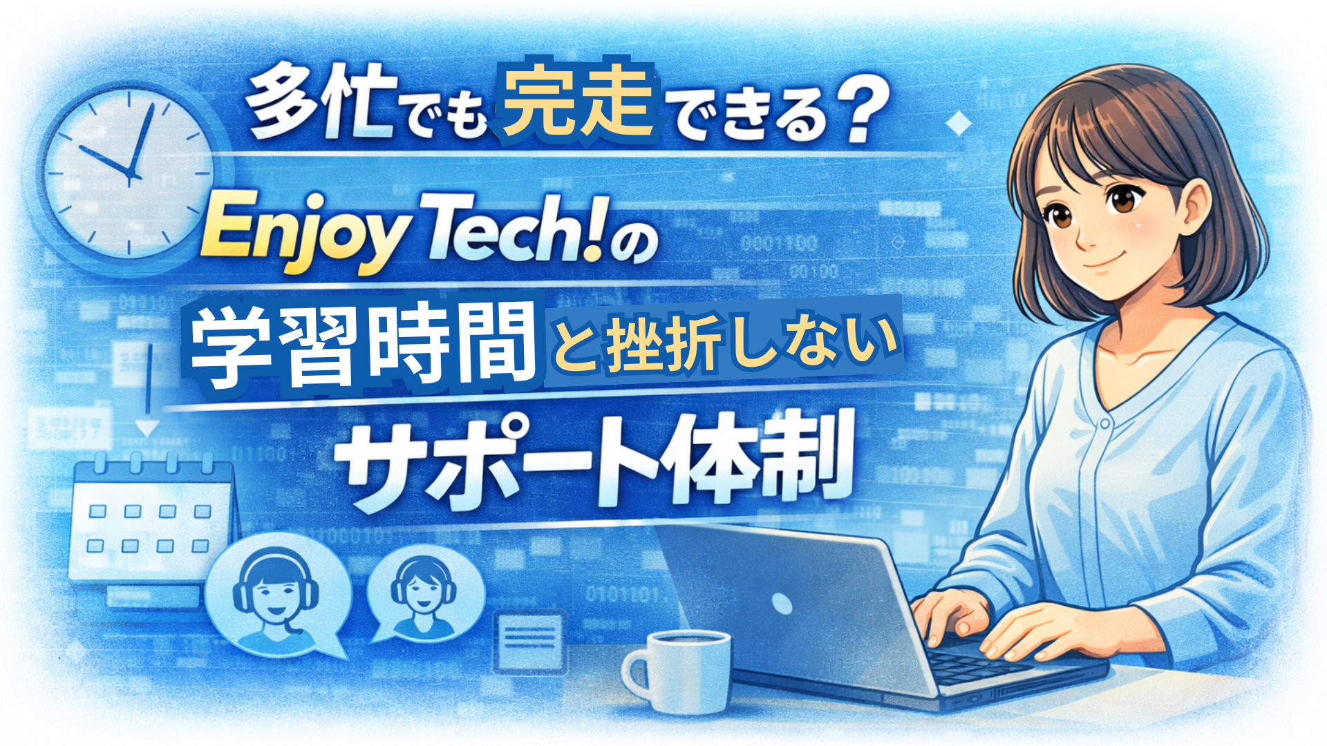 Enjoy Tech! 無料カウンセリングでは、このようなコスト面やサポート体制の詳細についても、包み隠さず質問することができます。他校の資料請求や説明会ですっきりしなかった疑問点があれば、ぜひ比較対象として具体的にぶつけてみてください。