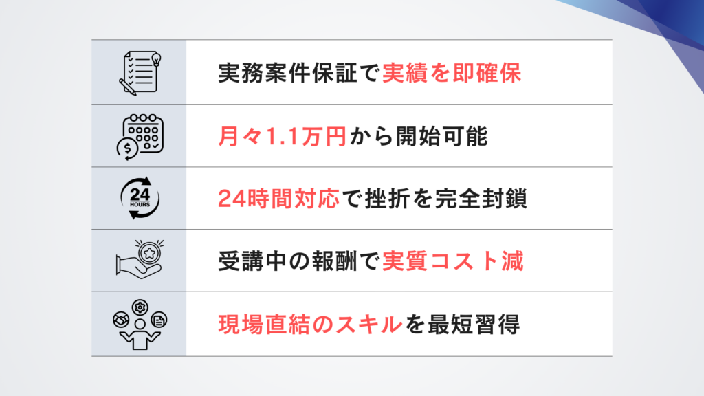 他社には稀な「実務実績の保証」が含まれるため、転職市場での価値は格段に高まります。