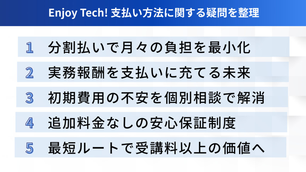 受講料を支払うことは、単に知識を買うことではなく「未来の自分への投資」です。Enjoy Tech! 支払い方法の相談とともに、こうした保証制度の活用方法を知ることで、心理的なハードルはさらに低くなるでしょう。